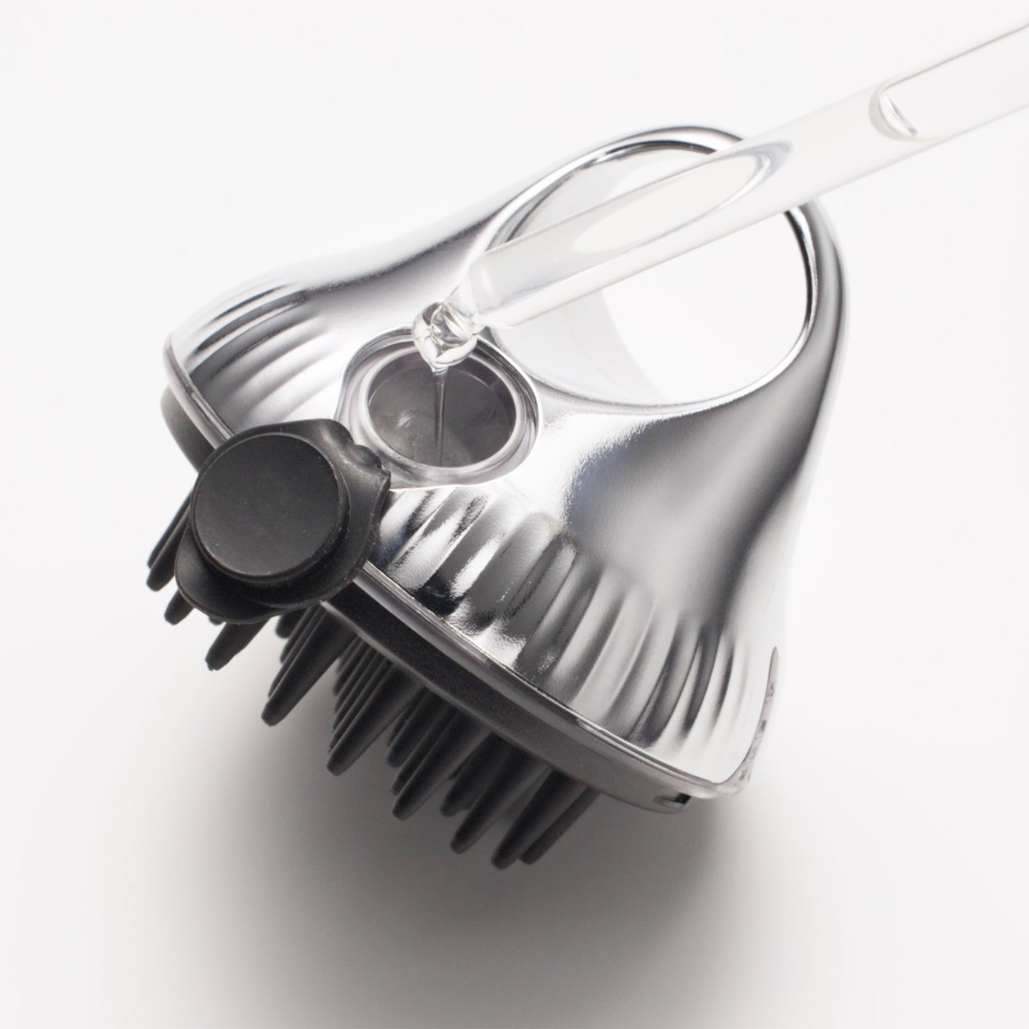— Press the cap button to load the applicator. Evenly distribute serum around the scalp.