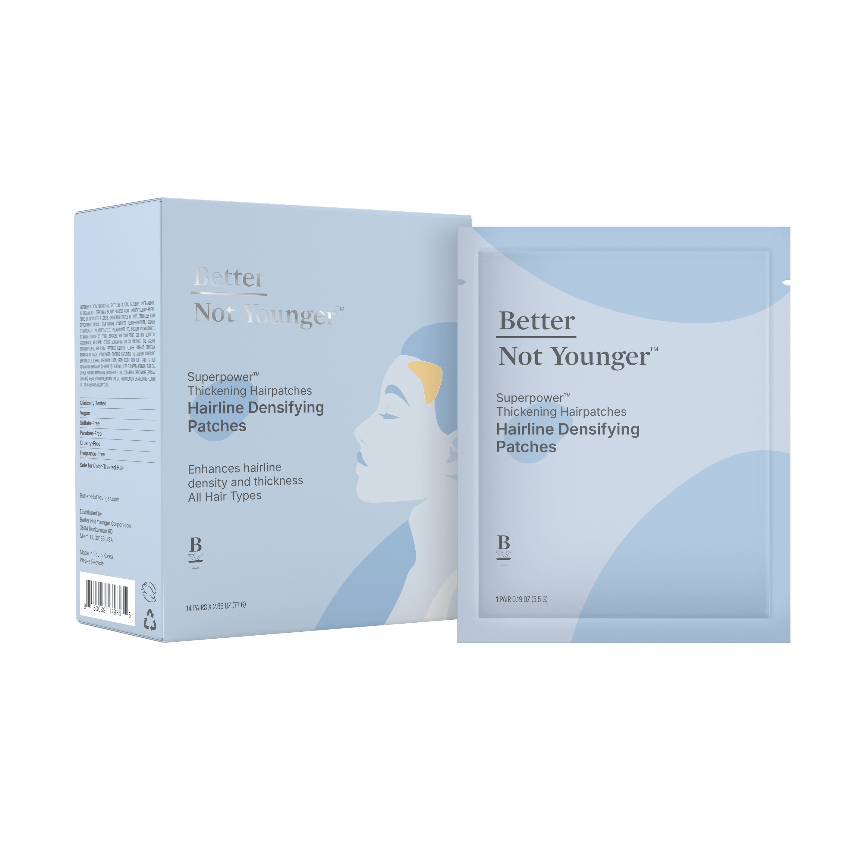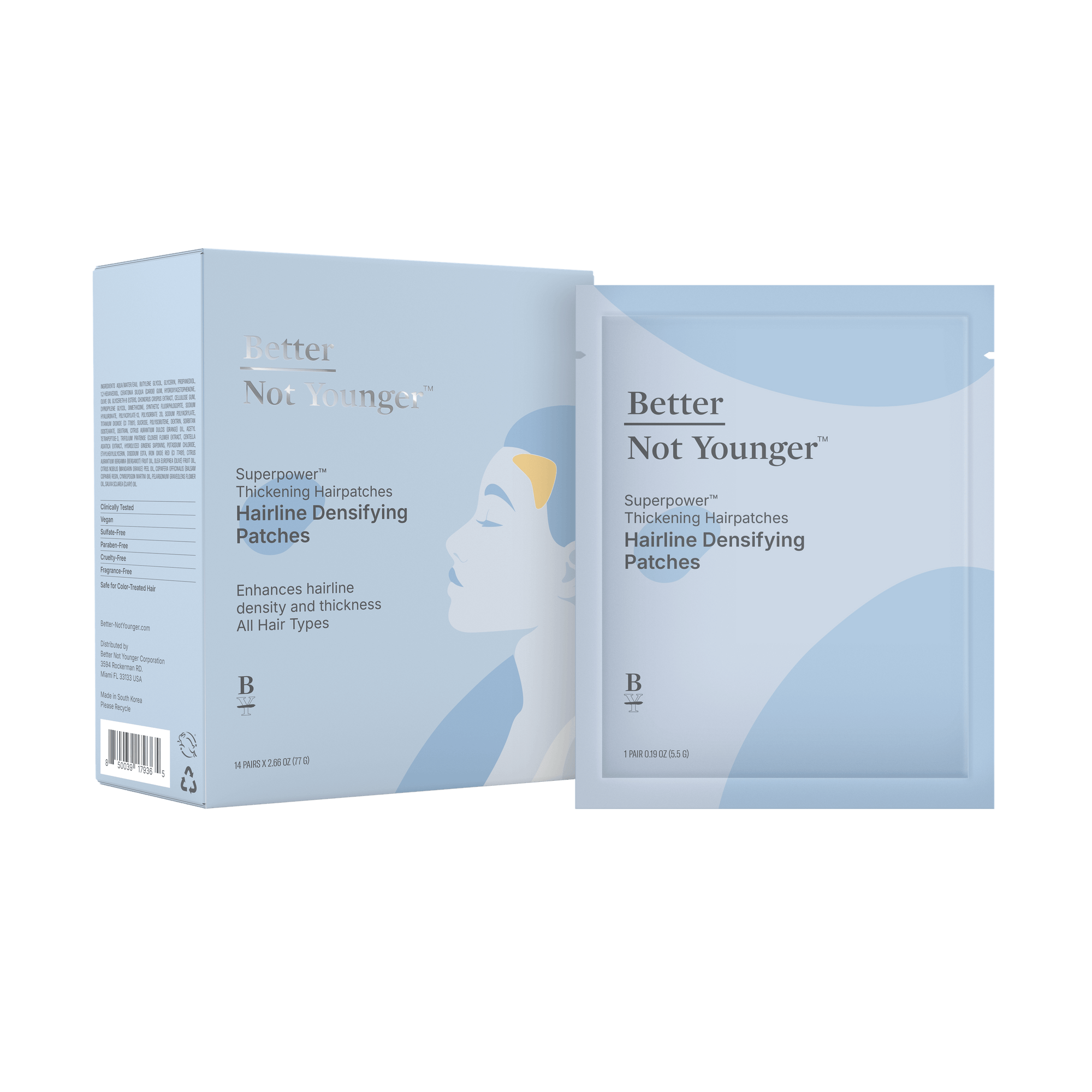 As a woman who values the health and appearance of my hair, I've been on the lookout for effective solutions to address thinning and loss that often accompanies aging. The Better Not Younger Superpower Thickening Hair Patches have quickly become a standout addition to my hair care routine, offering a convenient and promising approach to combatting these concerns. Each box of Better Not Younger Superpower Thickening Hair Patches contains 14 hydrogel patches, designed to be used for just 15 minutes every other day. The targeted application of these patches to the hairline and temples delivers a potent blend of ingredients directly to areas where many women experience thinning and loss as they age. Infused with Capixyl, Red Ginseng, and Centella Asiatica, these patches are formulated to promote denser, thicker-looking hair. While I've only been using them for a couple of weeks, I'm already beginning to notice a tangible difference in both the look and feel of my hair. The patches are easy and convenient to use, fitting seamlessly into my regular schedule, and I'm genuinely excited to continue using the rest of my first box and the additional box they sent. The fact that I'm feeling confident in the product's potential impact on my hair speaks volumes. Better Not Younger's Superpower Thickening Hair Patches have given me hope and optimism about addressing my hair concerns effectively, and I'm looking forward to experiencing the full results as I continue using this promising product. In conclusion, if you're a woman who values the health and appearance of your hair and is looking for a convenient and effective solution for hair thinning and loss, I highly recommend giving Better Not Younger Superpower Thickening Hair Patches a try. I'm genuinely excited about the potential of this product and the positive impact it may have on my hair's density and thickness.